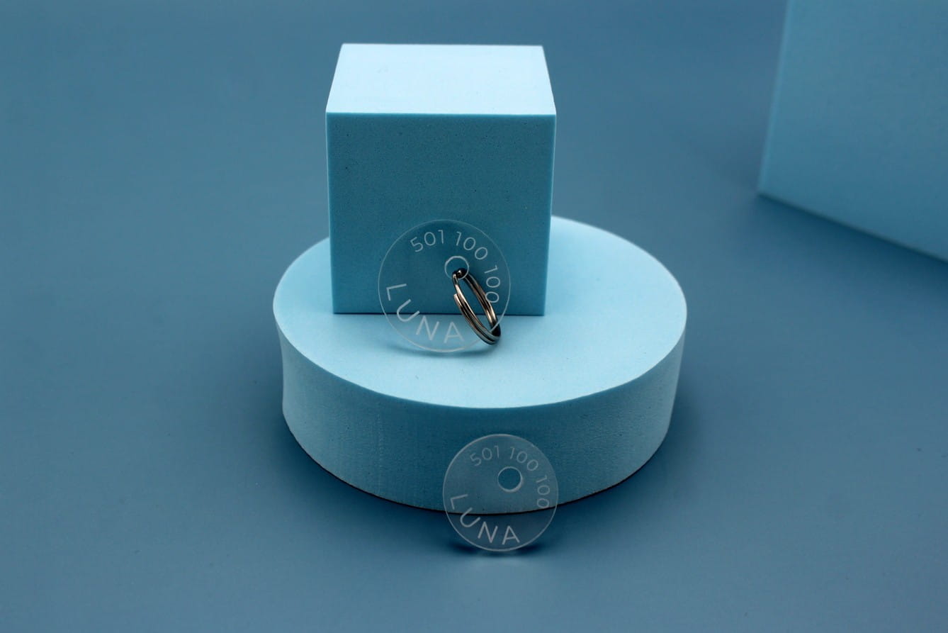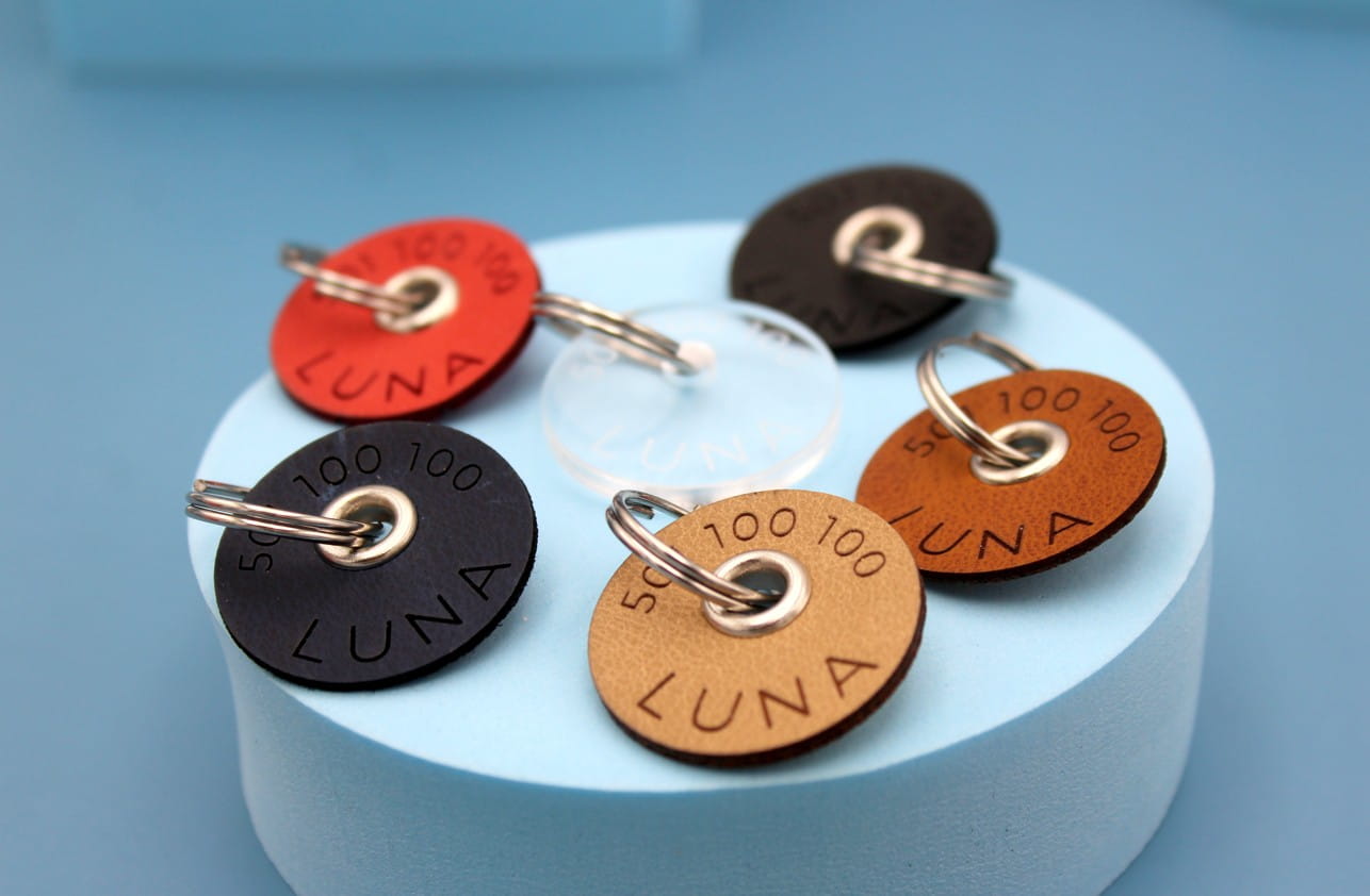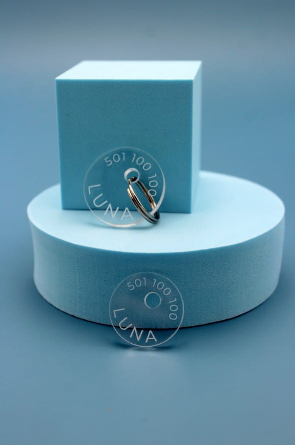 Zawieszka wykonana jest z trwałego materiału plexi, odpornego na warunki atmosferyczne. Dostępna w dwóch rozmiarach – do wyboru – i sprzedawana w zestawie z karabińczykiem.