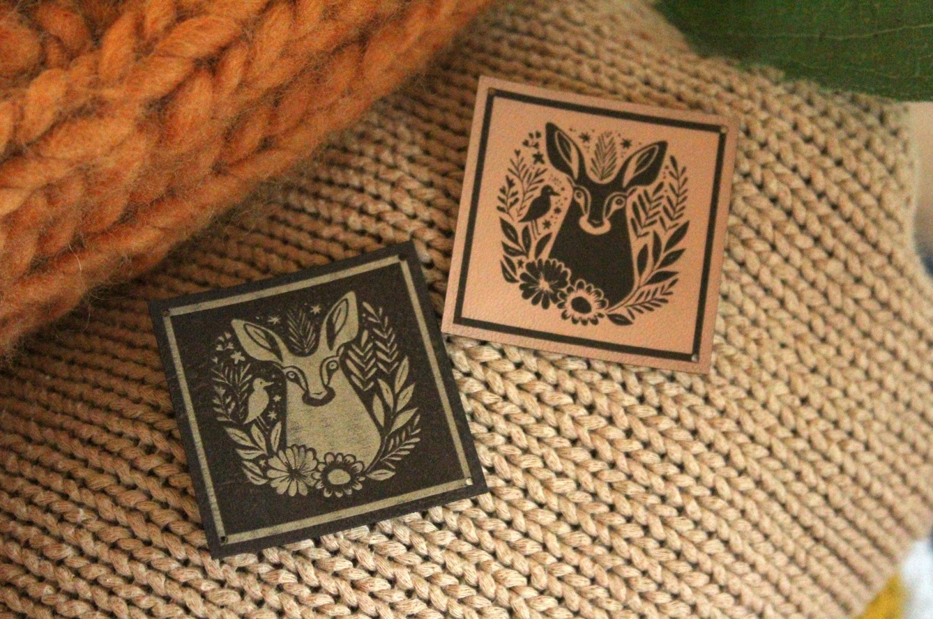 Metka z ramką do naszycia i otworkami w rogach.