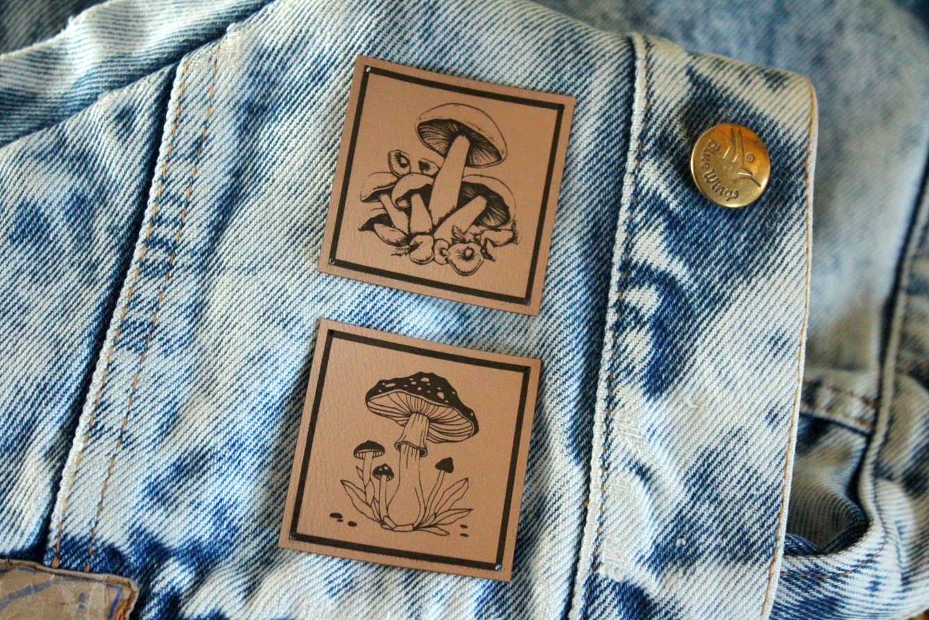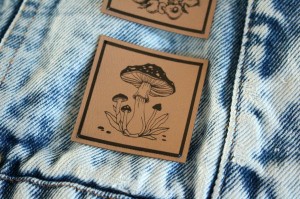 Metka z ramką do naszycia i otworkami w rogach.