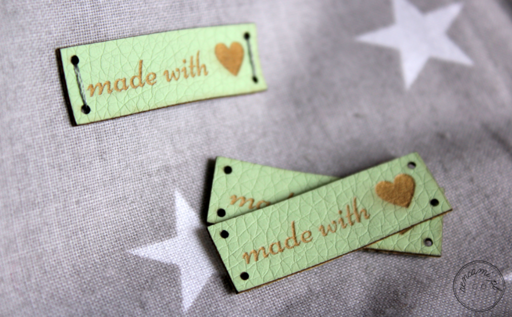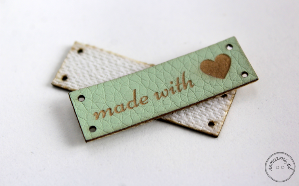 Metka z ekoskóry z napisem.