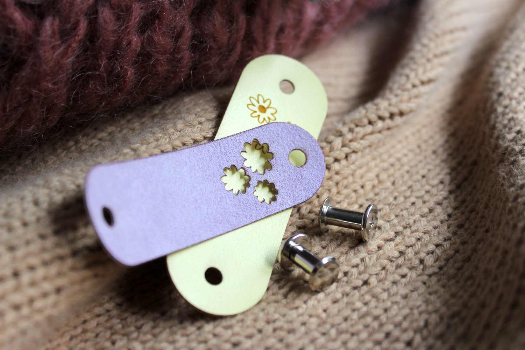Ażurową metkę z ekozamszu którą możesz założyć samą lub razem ze skórzaną metką